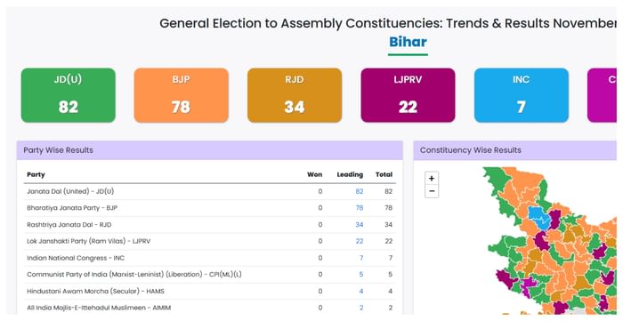सुबह 11 बजे तक के चुनाव आयोग के आंकड़ों के अनुसार, जदयू 81, भाजपा 78, राजद 35, लोजपा रामविलास 22, कांग्रेस 7, सीपीआईएम 4 और हम पार्टी भी 4 सीटों पर आगे चल रही है।